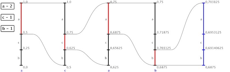 Na obrázku níže vidíme aritmetické kódování řetězce acab. Začíná se s intervalem 〈0; 1), výsledek je libovolné číslo z intervalu 〈0,6875; 0,703125).