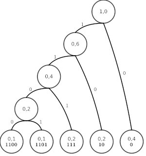 Shannonovo-Fanovo kódování odvozuje kódová slova přímo od pravděpodobností výskytu kódovaných symbolů (adaptuje se na data). Nejlepších výsledků dosahuje, když jsou pravděpodobnosti výskytu kódovaných symbolů záporné mocniny 2. Huffmanovo kódování však v praxi generuje o něco lepší kód. K vytvoření kódu symbolů je použit binární strom. Symboly jsou listy stromu, jehož hrany reprezentují kód symbolu (např. levá hrana znamená bit 0, pravá bit 1). Konstrukce stromu vypadá následovně.