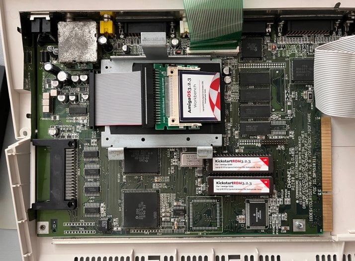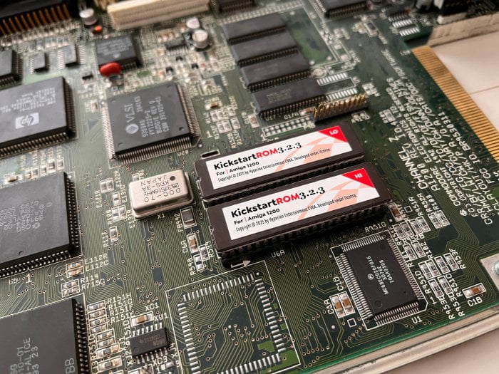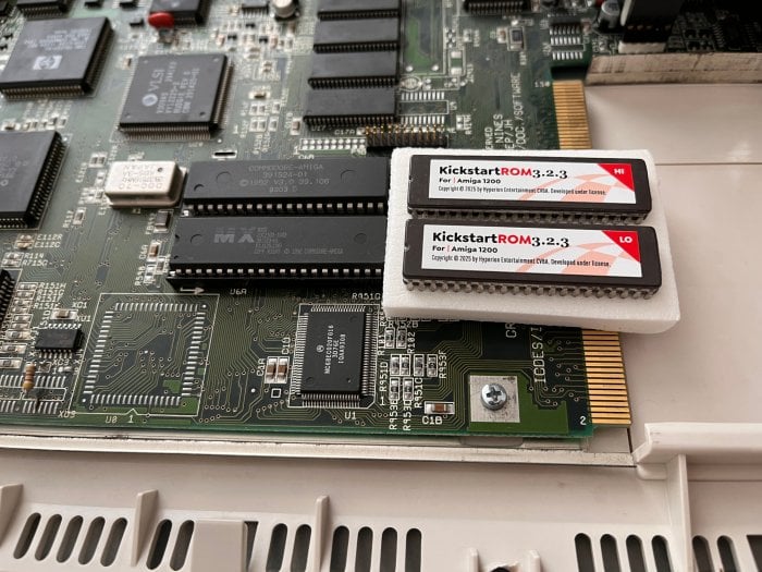 ROM: ROM je tvořena dvěma čipy, každý má 512 kB, nicméně z obou se používá prvních 256 kB, které dohromady obsahují používaná data Kickstartu o velikosti právě 512 kB, druhá polovina ROM čipů obsahuje duplicitní data. V mém případě ROM obsahuje Kickstart 3.0, sestavení 39.106.