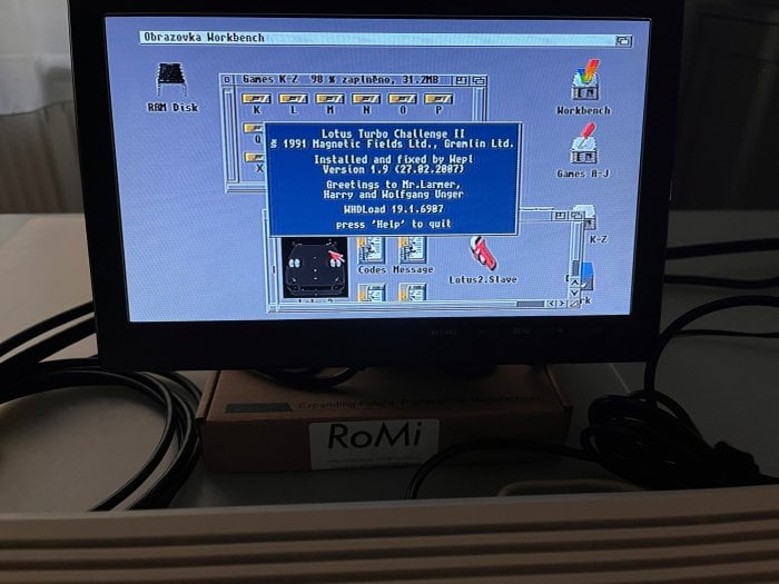 Již běžící AmigaOS 3.2, ofoceno z obrazovky. Složka (je vytvořena jako samostatný disk) s WHDLoad hrami, a otevřen šuplík s Lotusem III.