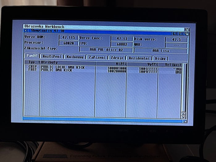 Výpis konfigurace počítače, je zde vidět původní CHIP RAM o velikosti 2 MB, a poté FAST RAM tvořená kartou ve slotu.