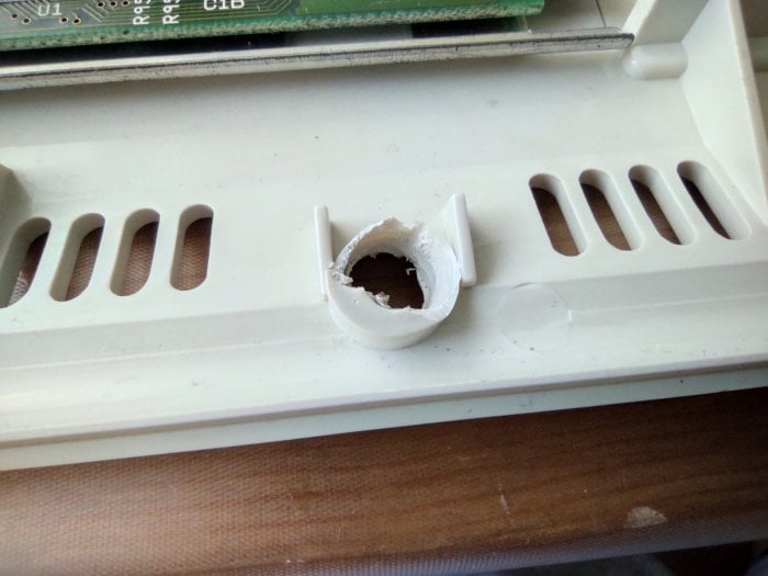 Tedy až na místa, kde dochází k vzájemnému uchycení krytů šroubky. Očividně častým otevíráním je plocha pro prostřední šroubek úplně utržená, ostatní poškozené. Sloupky se závitem jsou taky popraskané.