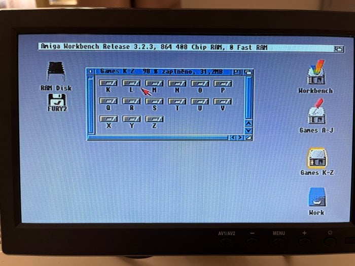 Nyní mohu využít benefitů veškerých přednahraných WHDLoad her. Musím říct, že ten komfort je návykový. Na disku je vše uloženo do podsložek dle prvního písmena názvu, takže jen otevřít správný šuplík, dohledat požadovanou hru ke spuštění, otevřít její šuplík a poklikat na ikonu. Spouštění všeho je velmi rychlé, bez čekání na čtení z FDD.