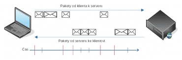 Informace postranního kanálu ilustruje následující obrázek. Klient komunikuje se serverem a v modelové interakci se střídají. Ilustrativní časová osa zjednodušeně vyznačuje časy začátků „shluků paketů“ (červené svislé větší čáry) a jednotlivých paketů uvnitř shluků (modré svislé kratší čáry).