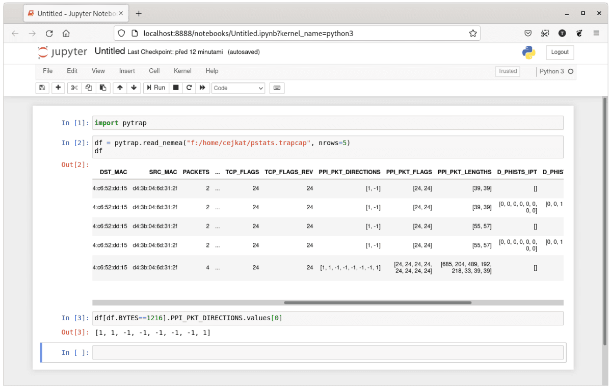 Následující obrázek ilustruje rozšířené IPFIX záznamy vygenerované pomocí open source nástroje – exportéru síťových toků ipfixprobe. Tato data byla převedena pomocí systému NEMEA do formátu pandas Dataframe (vizualizováno v Jupyter notebooku). Záznamy reprezentují obousměrnou komunikaci a kromě tradičních informací obsahují velikosti, časové značky a směr prvních paketů: