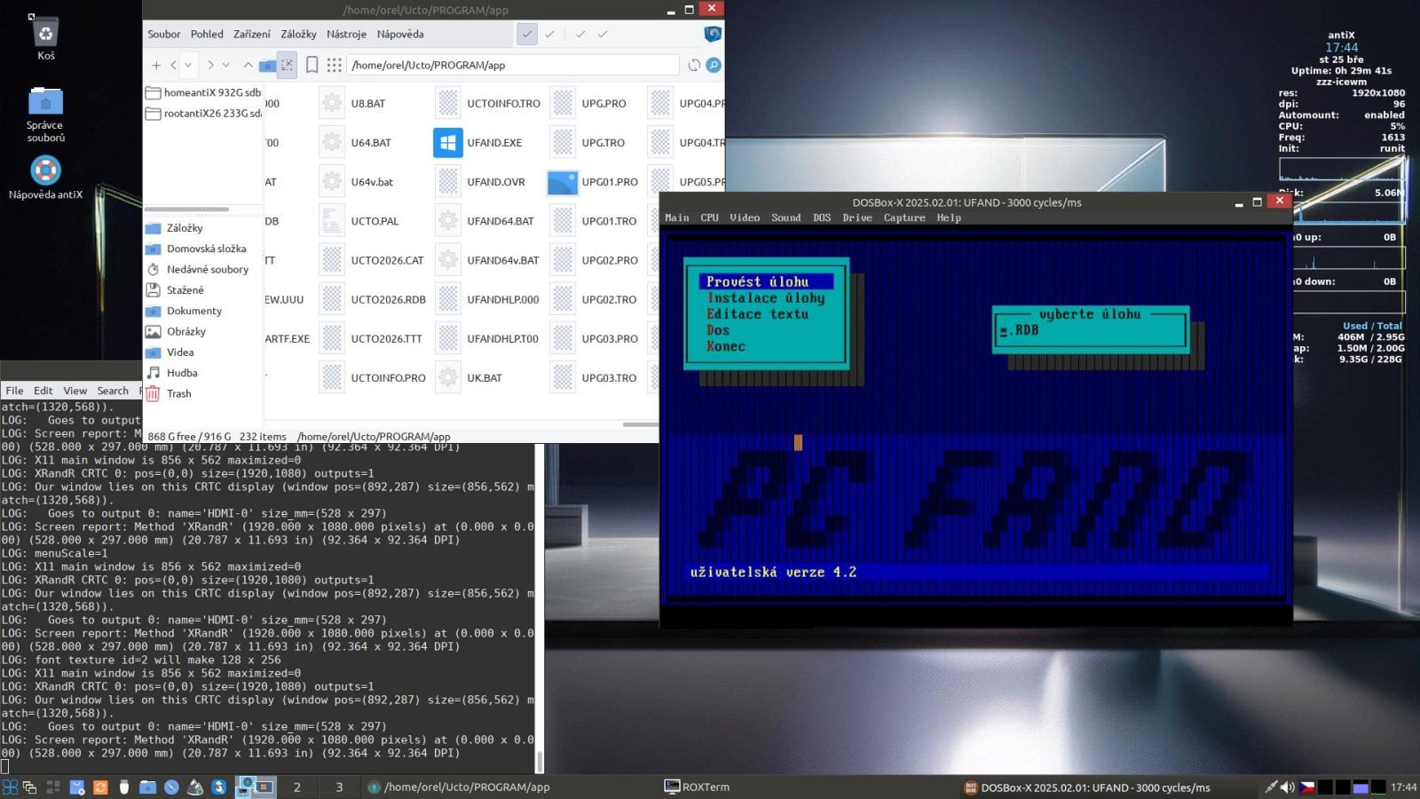 Na druhou stranu instalovat antiX na moderní PéCéčko asi nebude to pravé. Když vidím paní účetní v úctyhodném věku, která pouze pomocí klávesnice tančí ve fandovském Účtu, musím říci „klobouk dolů“. Není divu, uživatelské rozhraní se téměř nezměnilo, autoři jen přidávají potřebnou funkcionalitu pro aktuální legislativu a uživatel je rád, že má před sebou již třicátým rokem de facto stejný systém.