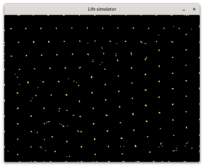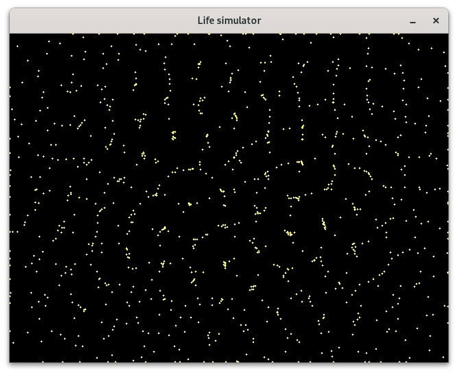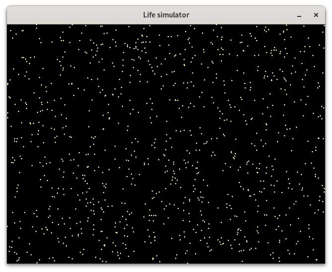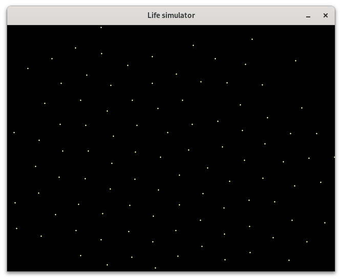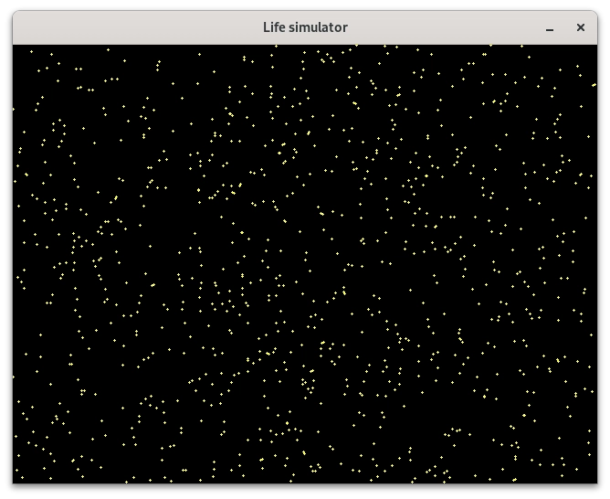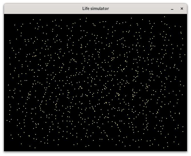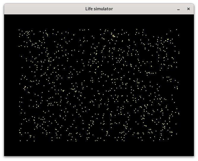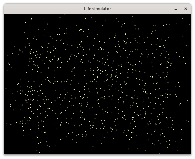Pro překlad a slinkování programu určeného pro vykreslení statického částicového systému je nutný překladač céčka (GCC, TCC, Clang atd.) a knihovna SDL2 (její vývojářská varianta). Po spuštění příkladu by se měla zobrazit obrazovka s přibližně 1000 částicemi. Může jich být méně, pokud se některé částice překrývají: