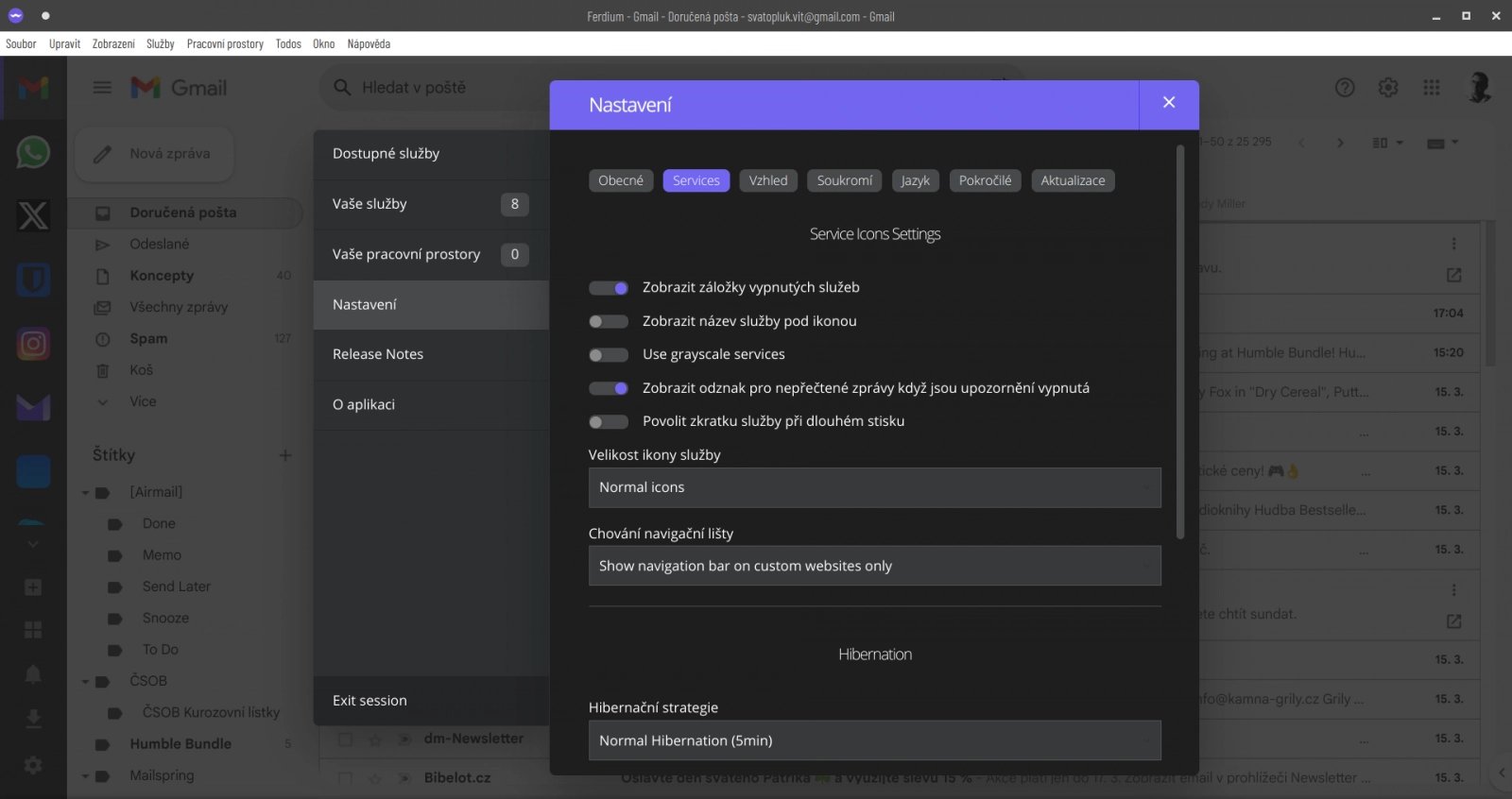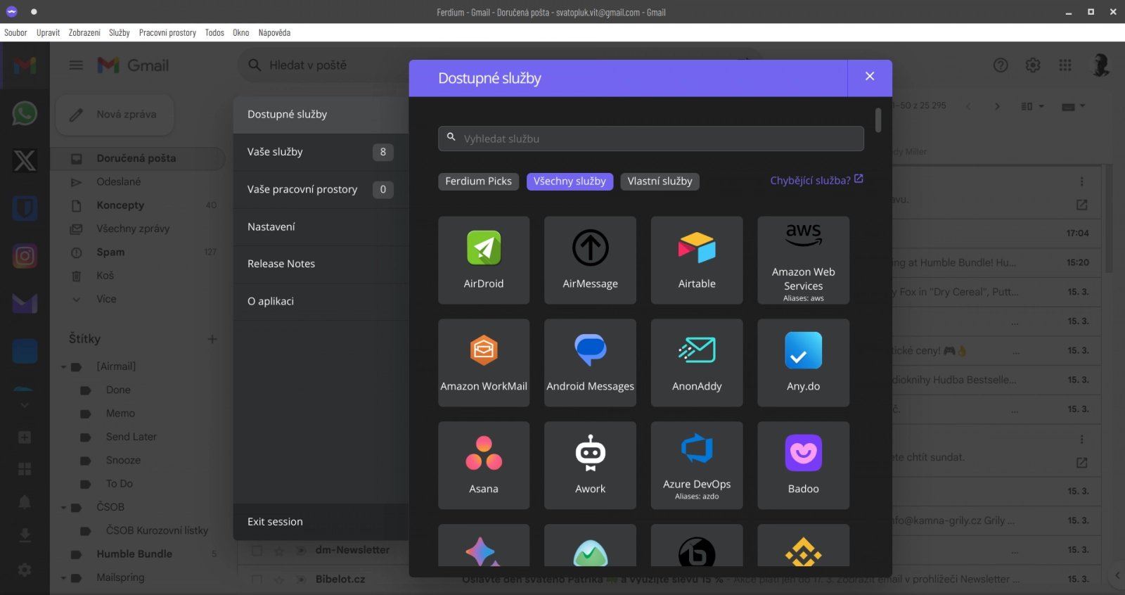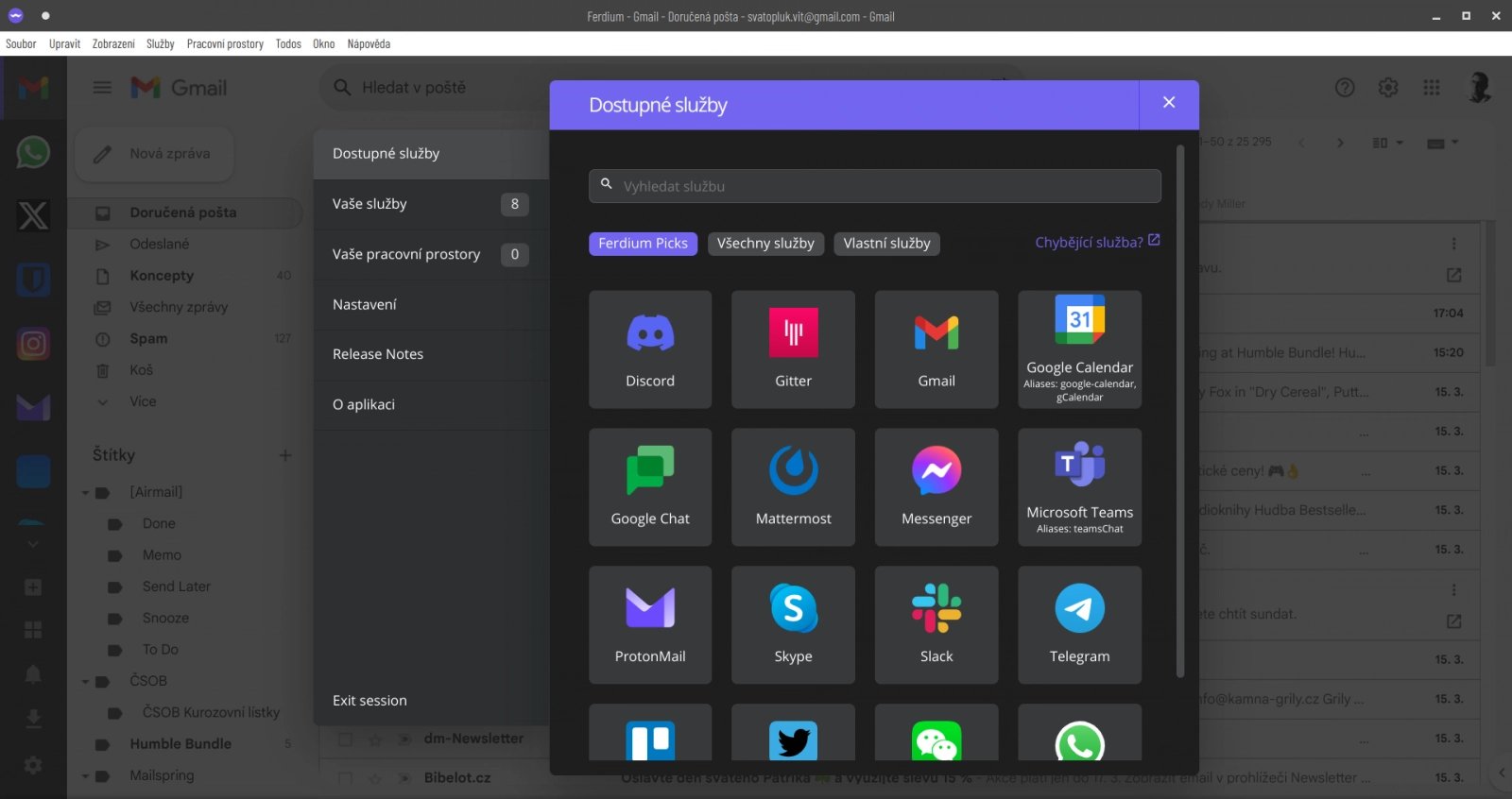 Ferdium v základu nabízí propojení na 200 různých webů/aplikací/služeb. Své osobní portfolio dvou služeb jsem však rázem rozšířil – mám tam nejenom WhatsApp a Twitter/X, ale i Gmail, ProtonMail a Bitwarden, Discord, GitHub, YouTube, YouTubeMusic, Jamendo a patrně bych asi dokázal připojit i více.