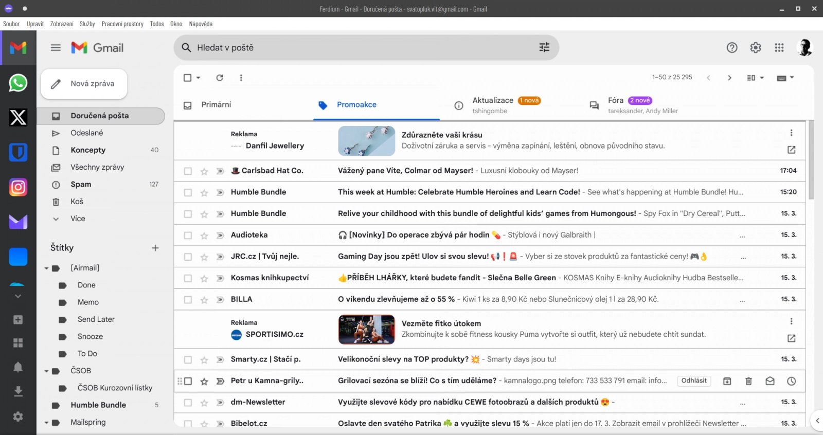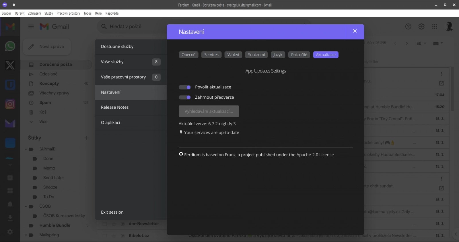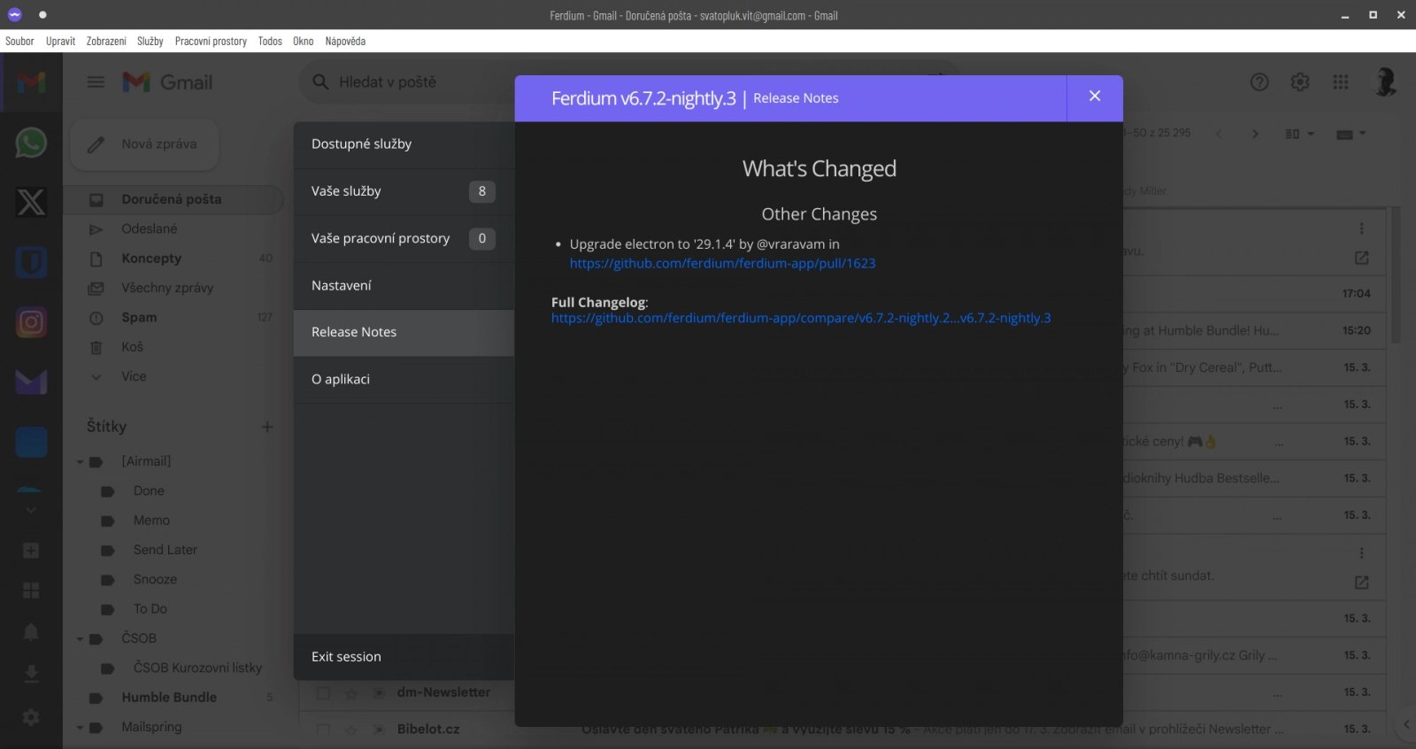 Ferdium v základu nabízí propojení na 200 různých webů/aplikací/služeb. Své osobní portfolio dvou služeb jsem však rázem rozšířil – mám tam nejenom WhatsApp a Twitter/X, ale i Gmail, ProtonMail a Bitwarden, Discord, GitHub, YouTube, YouTubeMusic, Jamendo a patrně bych asi dokázal připojit i více.