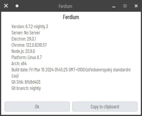 Ještě zde nepadla zmínka o tom, pro které operační systémy je Ferdium k dispozici – vězte, že to jsou všechny rozšířenější systémy na desktop jako Microsoft Windows (EXE instalátor i Portable verze), macOS (dmg i Homebrew) a samozřejmě Linux (DEB, RPM, AppImage a taky Snap a Flatpak, zmíněno je i FreeBSD). Z uvedeného výčtu je vidět, že by snad neměl existovat řádný desktopový systém bez možnosti Ferdium používat. Předpokládám, že i hodně linuxových distribucí má Ferdium v repozitářích, v mém Manjaru třeba je. Používám poslední verzi 6.7.2 (v polovině března 2024).