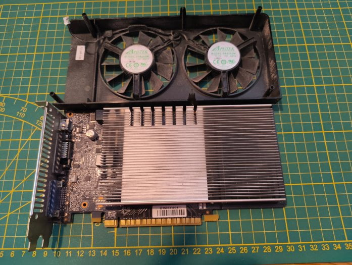 Chladič zaprášen, po 12 letech očekávám vysušenou teplovodivou pastu (neb po delší zátěži začne chladič běžet na vyšší otáčky a velmi, velmi dlouho mu po ukončení zátěže trvá, než klesne na otáčky základní – jasný znak špatného přenosu tepla z GPU).