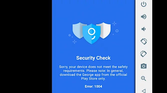 Chyba 1004 se zobrazuje v případě, kdy aplikace detekuje, že běží na virtuálním prostředí, což je tento případ. To je něco, čemu se snažíme zabránit, abychom ochránili aplikaci před manipulativními útoky. Z tohoto důvodu je třeba, abyste aplikaci George používal standardně na mobilním telefonu, na virtuálním prostředí již George nebude funkční.