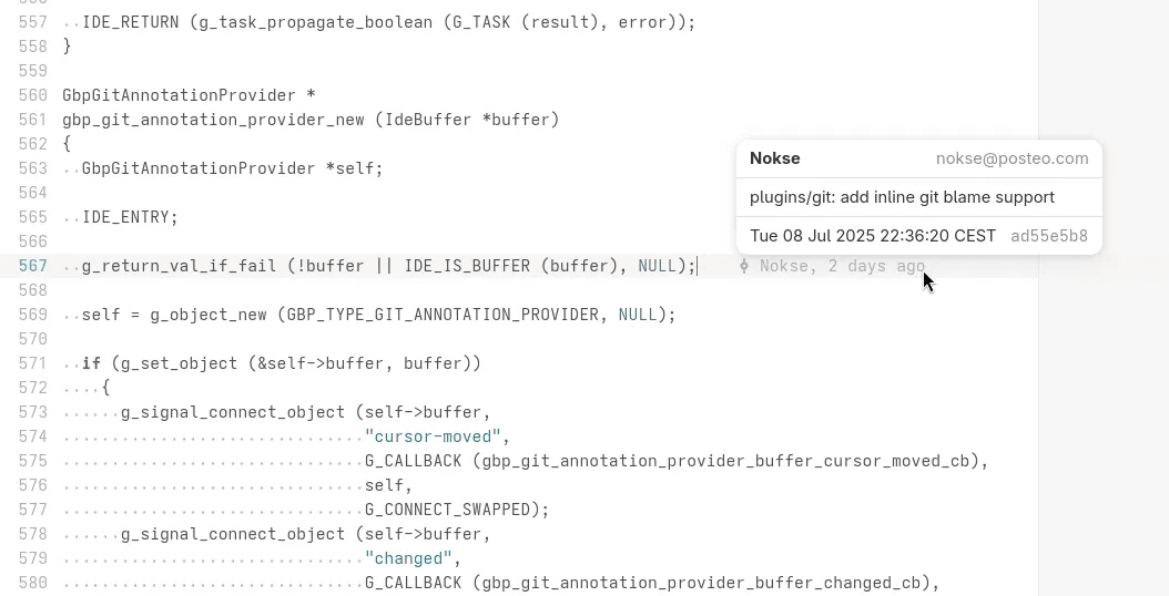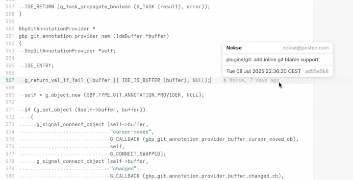 Vývojové prostředí Builder má taky nemalé množství novinek. Mezi ně patří například integrace git blame, kdy stačí kliknout na řádek kódu a zobrazí se vám, kdo a kdy tento řádek naposledy upravoval. Pokud máte dlouhý soubor s kódem, u posuvníku se vám zobrazují indikátory změn a diagnostiky, abyste se mohli v kódu lépe zorientovat. Ačkoliv se jedná o specializované vývojové prostředí pro GNOME, přibyla také podpora pro Arduino v podobě integrace nástroje arduino-cli.
