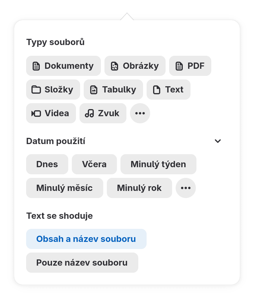 Soubory (aka Nautilus) mají nový popover s nastavením vyhledávání. Můžete si v něm nastavit, jaký typ souboru vyhledávat, filtrovat podle času použití a rozhodnout se, jestli chcete vyhledávat pouze v názvech nebo i obsahu souborů.