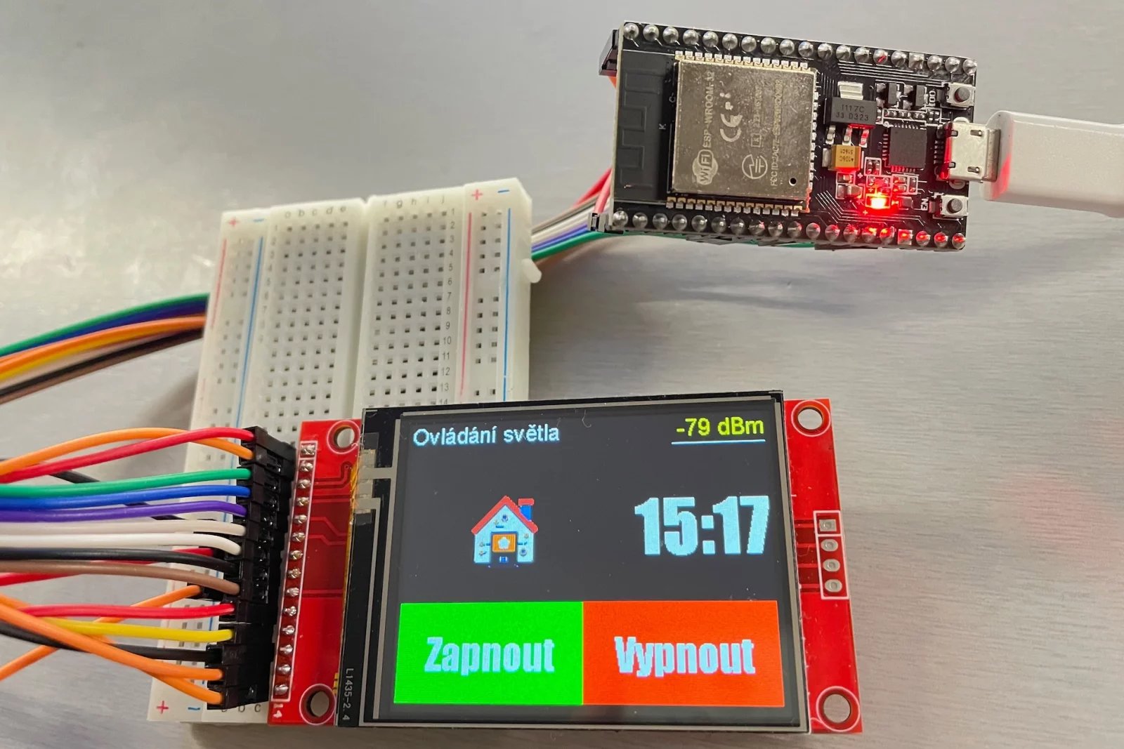 Funguje? Skvěle, v dalším kroku připravíme finální podobu displeje. Tedy dvě tlačítka pro zapnutí a vypnutí světla, na které na závěr nastavíme dotykovou oblast. Dále umístíme obrázek, který bude informovat o tom, zda-li žárovka svítí a pár dalších textových informací – nadpis, sílu signálu Wi-Fi a aktuální čas.