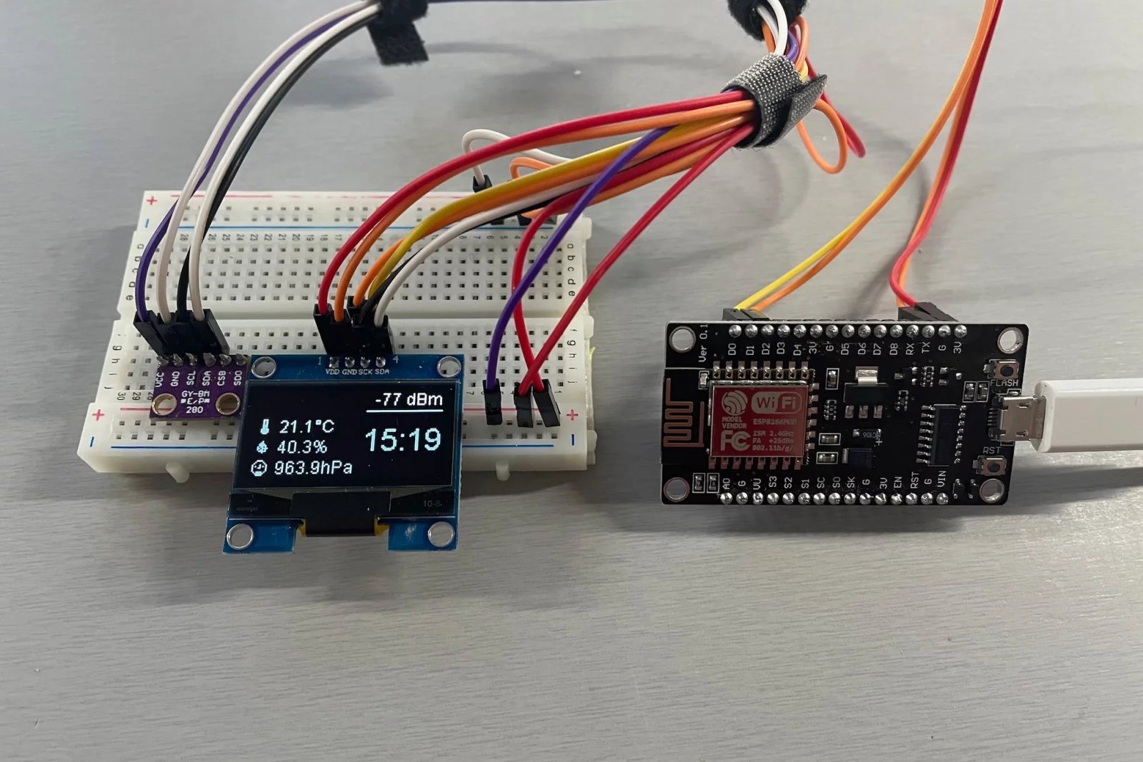 5V varianta tohoto senzoru komunikuje pouze na sběrnici I2C a obsahuje tak čtyři piny – napájení VCC+GND, SDA (přenos dat) a SCL (hodinový signál). 3,3V varianta tohoto senzoru podporuje i sběrnici SPI a tak kromě již zmíněných čtyř pinů obsahuje ještě i piny CSB (chip select) a SD0 (MISO – Master-Input, Slave-Output). Pro ukázku jsem využil 3,3V variantu senzoru, ale komunikace probíhala po I2C.