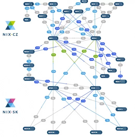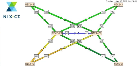 Spojení obou uzlů jsme nakonec provedli v polovině roku 2019 a z hlediska topologie sítě se nejednalo o velkou komplikaci. Ke konci téhož roku se sdružení rozhodlo rozšířit o další lokalitu: Vídeň. To již znamenalo změnu topologie a obecně kompletní revizi struktury celé sítě. NIX byl od roku 1997, kdy začal fungovat, vždy provozován jako čistě L2 infrastruktura. Ještě v roce 2020 byl NIX po spojení obou uzlů v topologii dvojité hvězdy (dual star). To však bylo nutné změnit s ohledem na připojení třetího města.