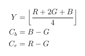 Tato transformace vstupních složek se nazývá ICT (Irreversible Color Transform). Pro bezeztrátovou kompresi se použije transformace RCT (Reversible Color Transform), vizte rovnici níže, kterou lze vypočíst aritmetikou celých čísel (integer). Po převodu do YCbCr může následovat podvzorkování barvonosných složek. Složky jsou dále zpracovávány nezávisle.
