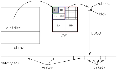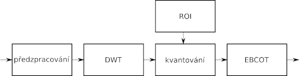 Na obrázku výše vidíme schéma komprese metodou JPEG 2000. Předzpracování znamená transformaci barevného modelu obrazu a jeho rozsekání na dlaždice. Následně se na každé dlaždici spočítá diskrétní vlnková transformace (DWT). Koeficienty DWT se pak kvantují a některé z nich mohou být předsunuty před ostatní (ROI). Posledním krokem je kompresní algoritmus EBCOT, který kóduje DWT po bitových rovinách.