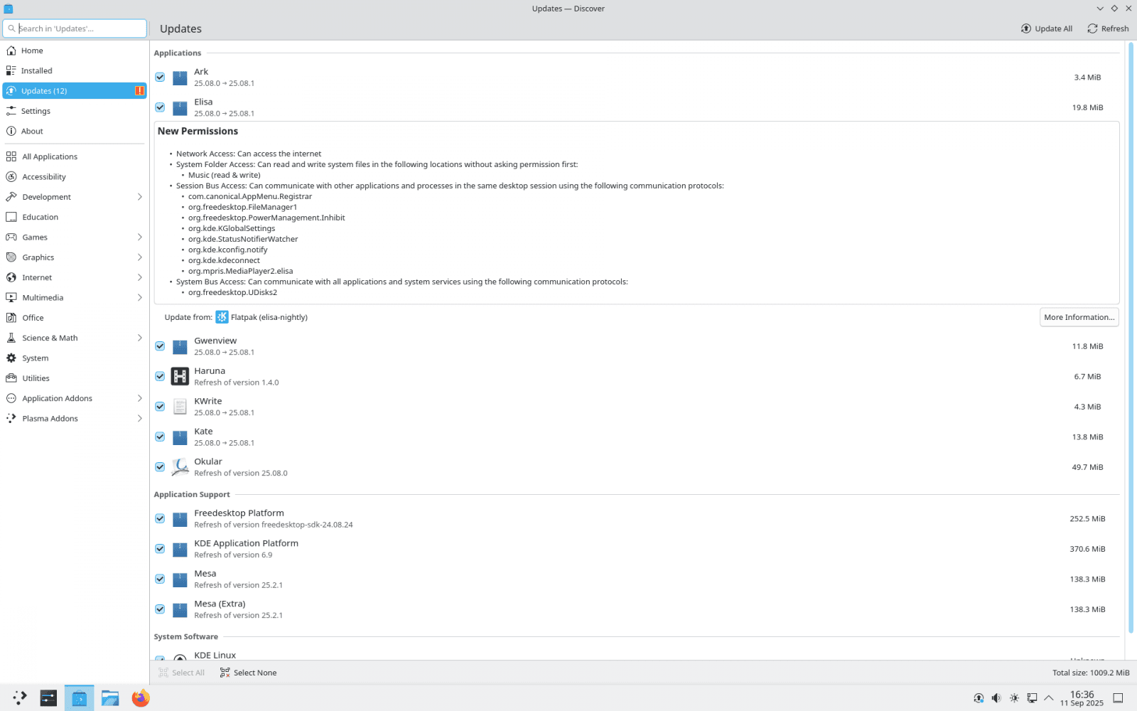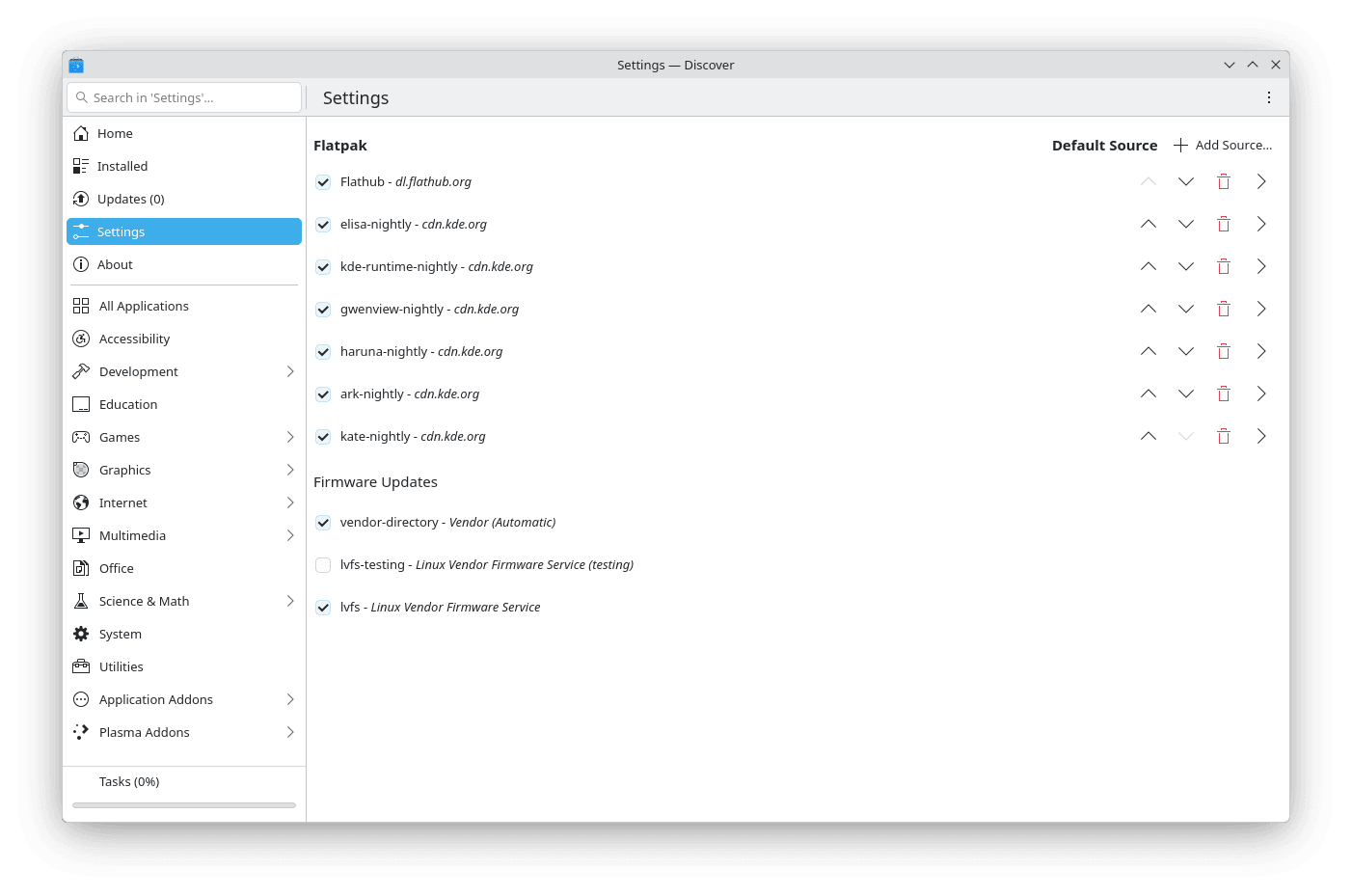 Ve výchozím nastavení jsou aktivní mnohé repozitáře, řada KDE aplikací používá Nightly sestavení a je předpřipraven subsystém Flatpaků a také Snapů (žádný Snap se ale ve výchozí instalaci nenachází).