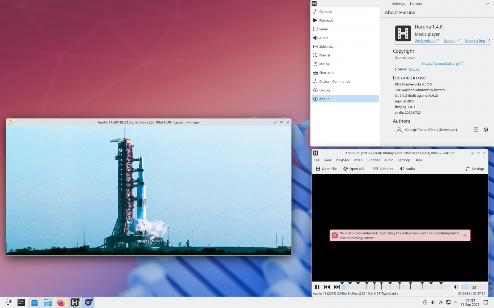 Z rychlého průzkumu jsem pouze zaznamenal, že použitá GUI nadstavba nad MPV, tedy přehrávač Harumi, si neporadí s H.265 videi, hlásí absenci kodeku, ač má v pozadí běžící MPV. Když z Flathubu doinstaluji MPV, tam běží vše bez potíží – bude to nějaká drobnost (možná bych mohl reportovat bug), nicméně řešitelná obvyklou cestou: použijte svůj preferovaný přehrávač.