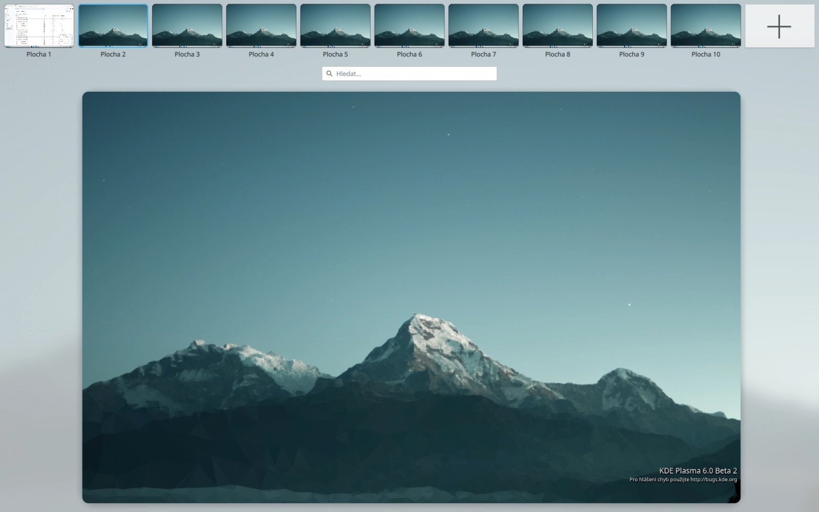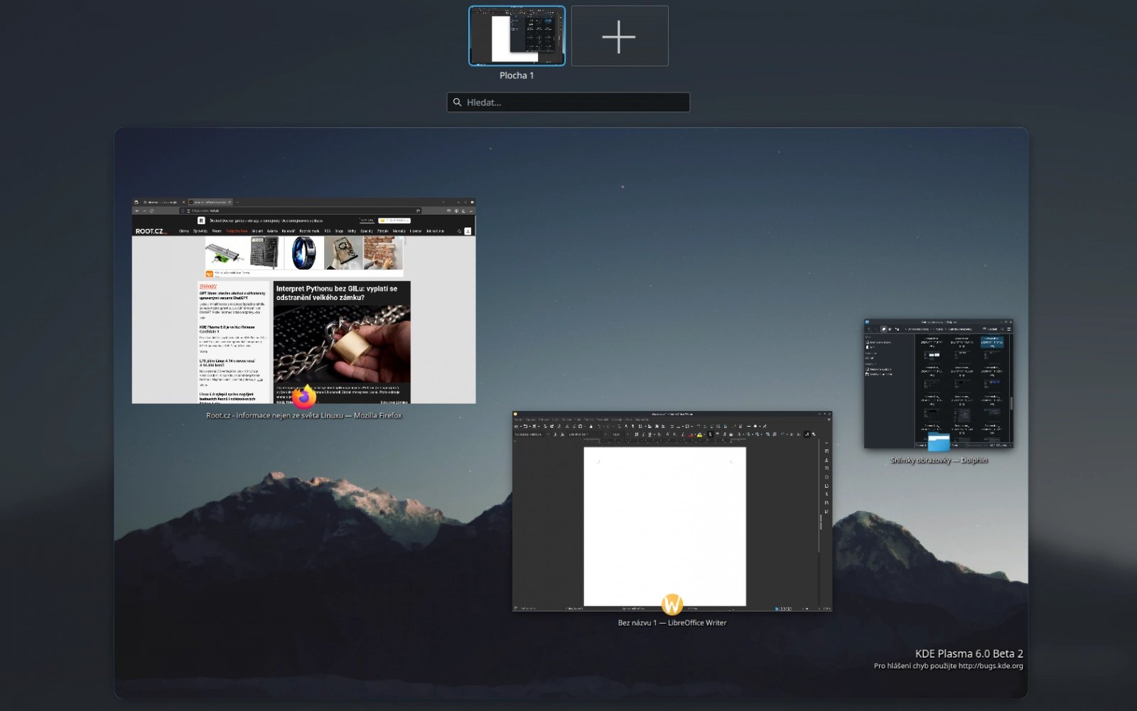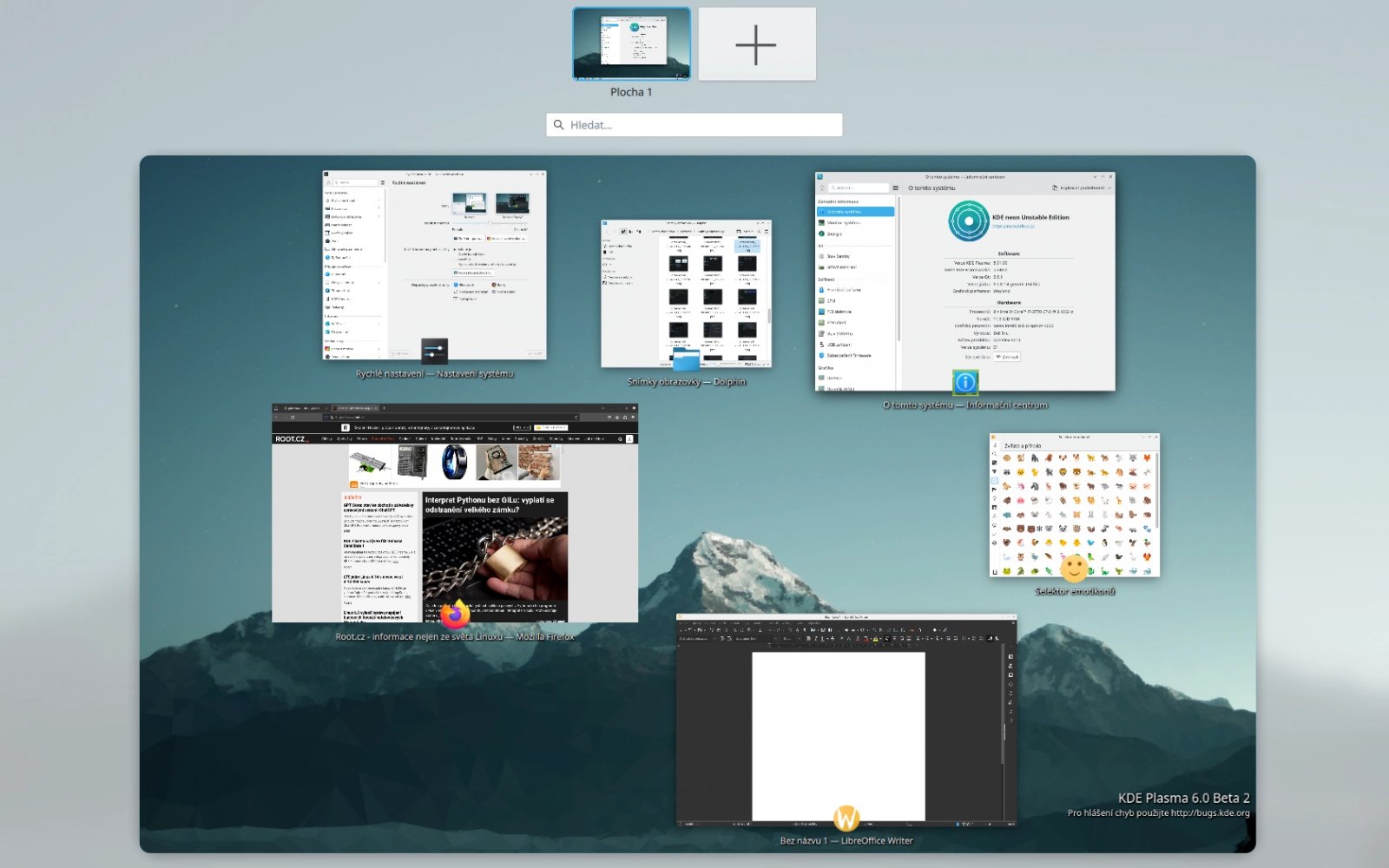Subjektivně se mi prostředí líbí, včetně přehledové grafiky při najetí myší do levého horního rohu – zobrazí přehled oken aplikací a ploch. I k Plasmě 6.0 mám ale stále stejnou výhradu jako k pětkové řadě: rozházení oken dané plochy je v tomto přehledu divné a o hodně horší, než jak je srovnává GNOME. Ryze subjektivně bych také řekl, že zatímco u Plasmy 5.x jsem nezaznamenával zásadní rozdíl mezi světlým a tmavých schématem, přijde mi, že šestkové Plasmě výrazně více svědčí téma světlé.
