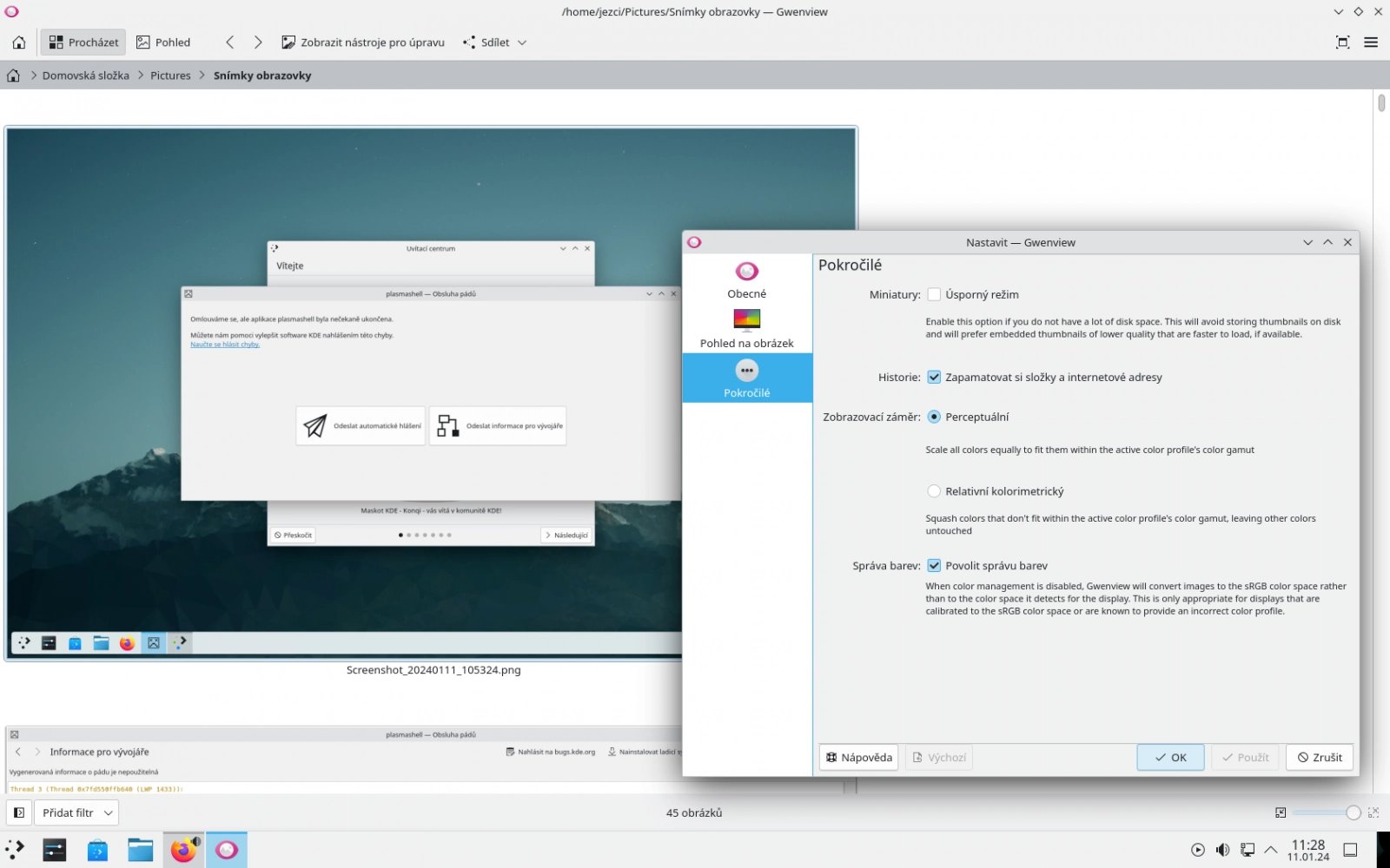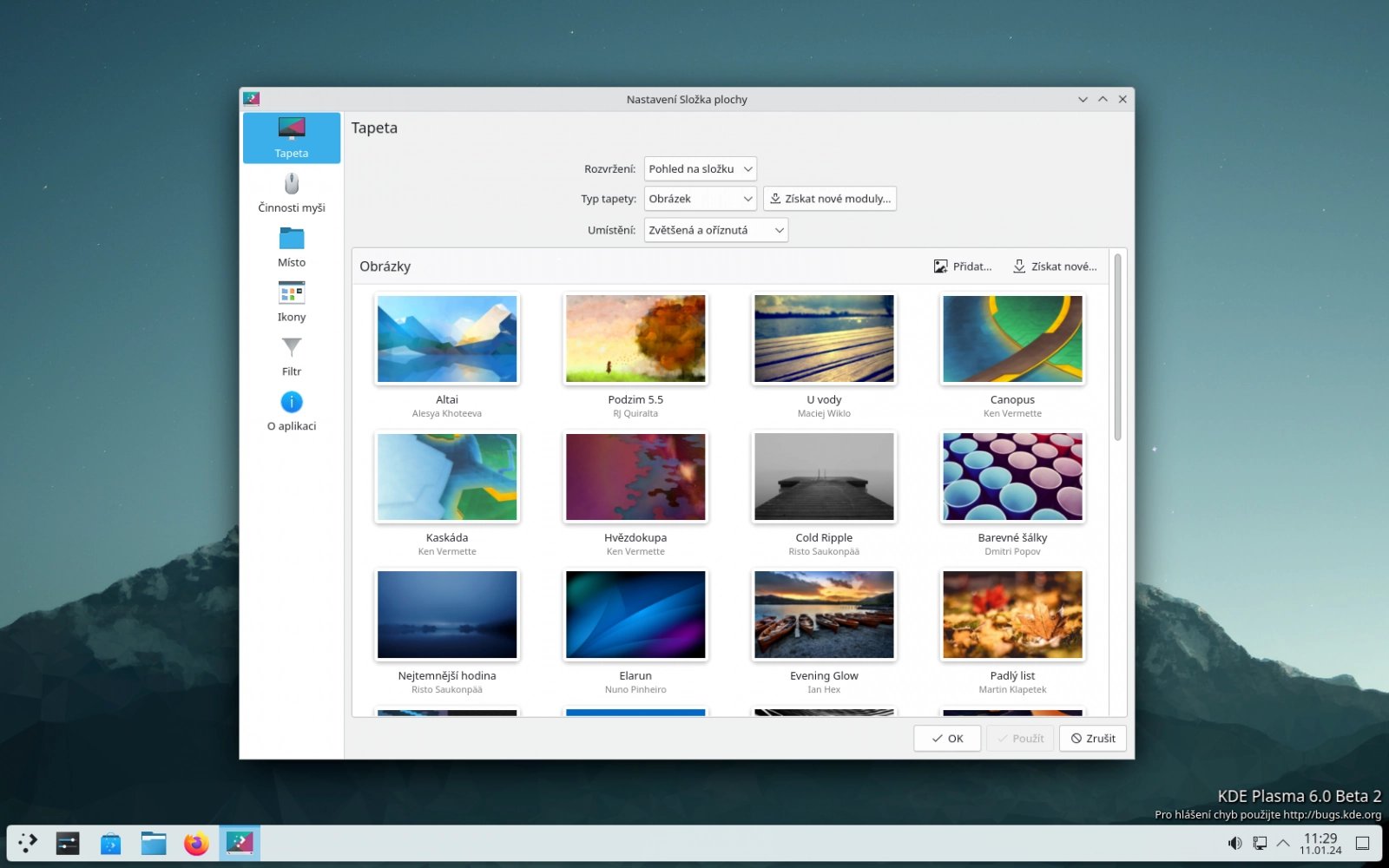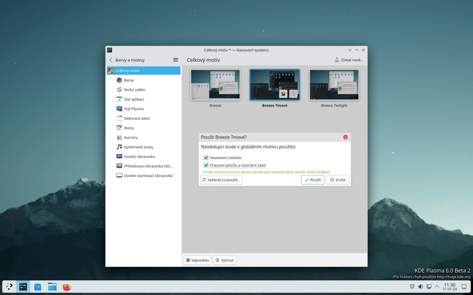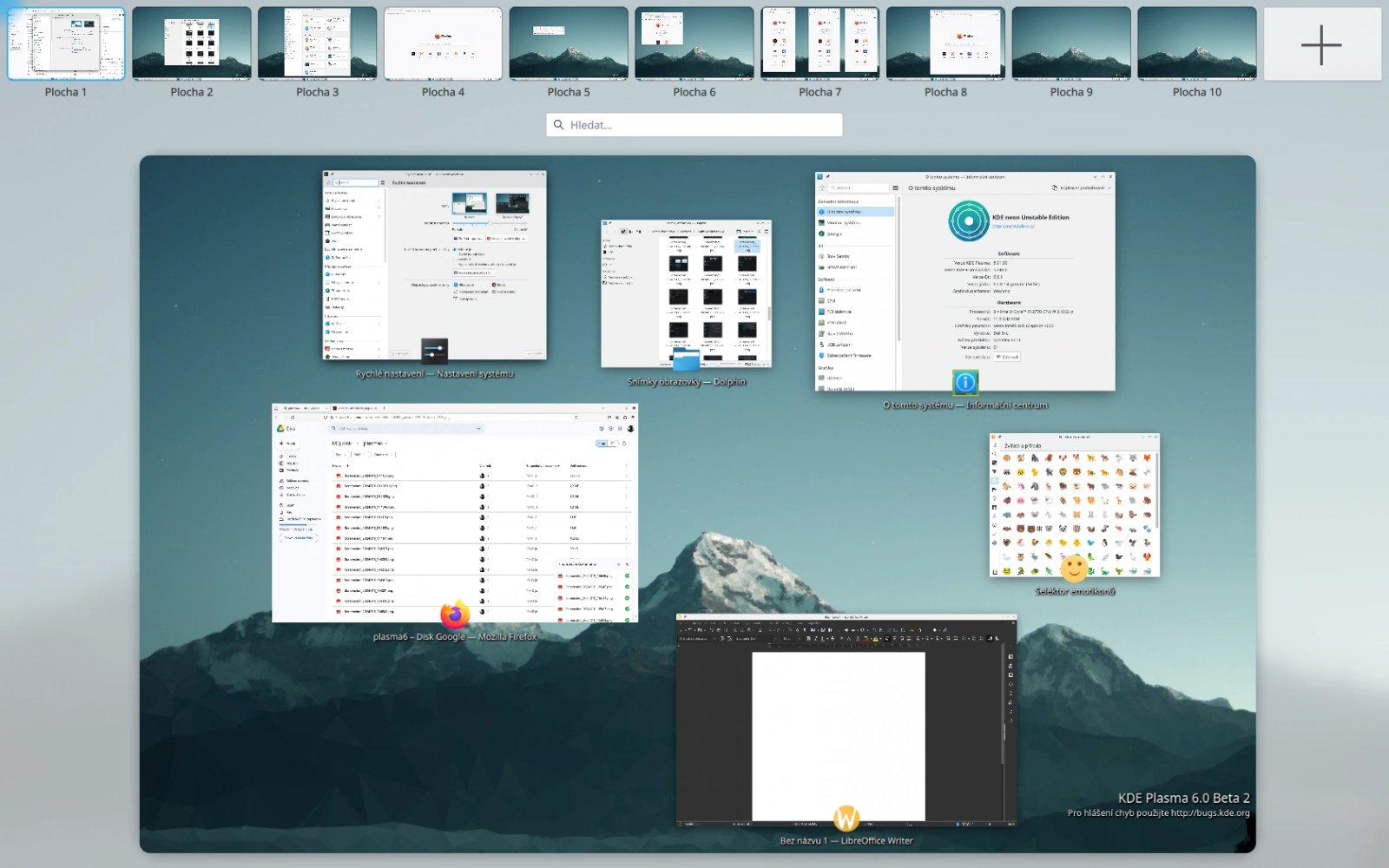 Subjektivně se mi prostředí líbí, včetně přehledové grafiky při najetí myší do levého horního rohu – zobrazí přehled oken aplikací a ploch. I k Plasmě 6.0 mám ale stále stejnou výhradu jako k pětkové řadě: rozházení oken dané plochy je v tomto přehledu divné a o hodně horší, než jak je srovnává GNOME. Ryze subjektivně bych také řekl, že zatímco u Plasmy 5.x jsem nezaznamenával zásadní rozdíl mezi světlým a tmavých schématem, přijde mi, že šestkové Plasmě výrazně více svědčí téma světlé.