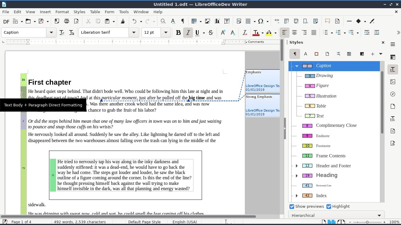 Všem aplikacím v nové verzi balíku přibývá podpora zoomovacích gest na touchpadech, a to pro hlavní okno aplikace. Nově zde najdeme i podporu barevných témat dokumentů, jejich importu a exportu z a do ODF i OOXML (tedy například nadpisů ve Writeru). Mnoho dílčích vylepšení doznává práce s písmy, speciálně s pravo-levým tokem v některých jazycích, dále CJK či jinými asijskými abecedami.