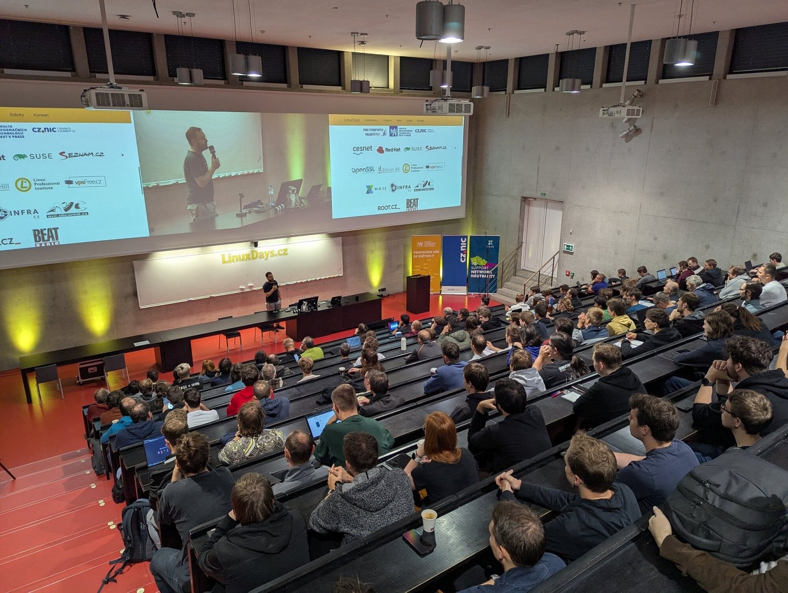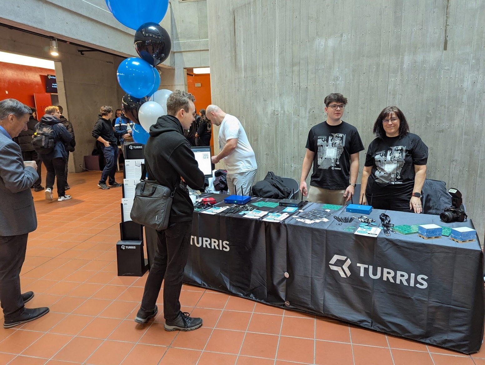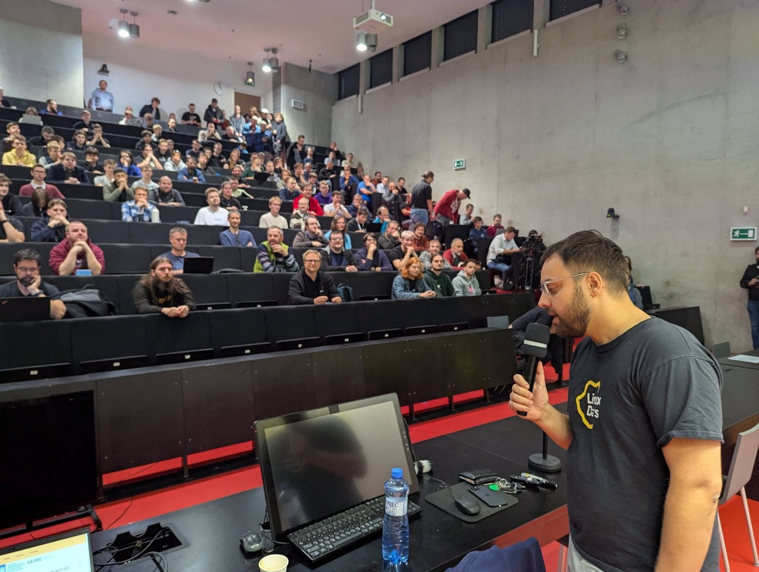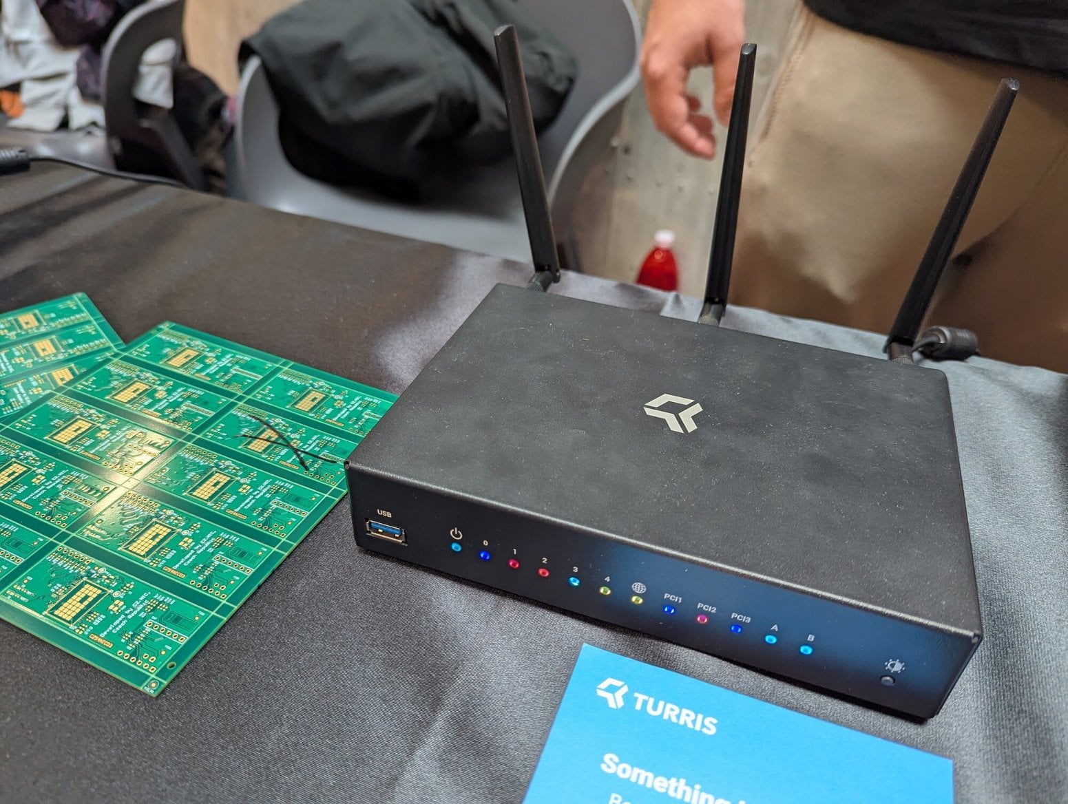 Michal Hrušecký přímo na LinuxDays poprvé veřejně představil nový router Turris Omnia NG, který během přednášky vybalil z krabice. Zdroj je poměrně velký a má výkon 90 W. Omnia typicky nežere tolik, ale je možné ji rozšířit o řadu periferií.
