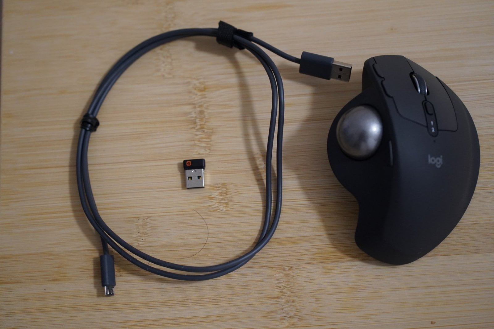 Připojení k počítači je možné buď přes Bluetooth, nebo pomocí Logitech Unifying Receiver – malého USB donglu, který umožňuje připojit více zařízení Logitech najednou. Bohužel, MX Ergo nemá žádný úložný prostor pro dongle, takže pozor, ať ho někde nezapomenete. Funguje bezproblémově jak v Linuxu, tak i v Microsoft Windows. S využitím Bluetooth jsem zkoušel i chytrou TV a také s tím nebyl problém. Jen drobnost – kabel slouží opravdu jen k nabíjení, nelze jím z bedrátového trackballu udělat drátový.