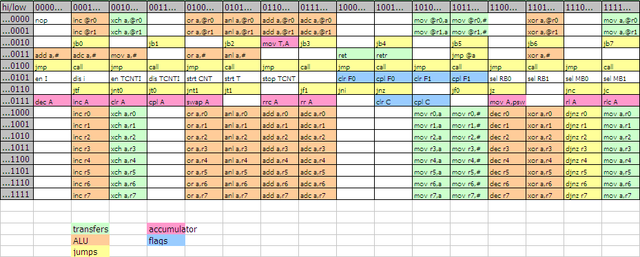 V pripade zajmu muzu poslat HTML verzi popr. .gnumeric nebo .ods (tabulka), v niz mam ty instrukce napsane jeste z dob, kdy jsem na MCS-48 vyvijel.