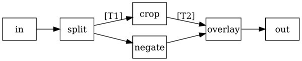 Následující příkaz otevře video, rozvětví ho, v první větvi provede ořez horní poloviny (zůstane spodní), ve druhé větvi provede negaci a překryv s ořezanou spodní polovinou.
