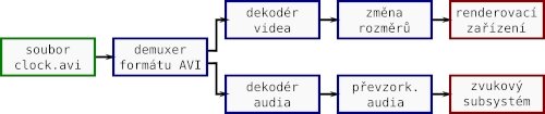 Na obrázku vidíme graf filtrů pro přehrávač videa. Zeleně je označen zdrojový filtr (soubor z disku), modře transformační filtry (demuxer, dekodéry, konvertory formátů) a červeně výstupní filtry (obrazovka, zvuková karta).