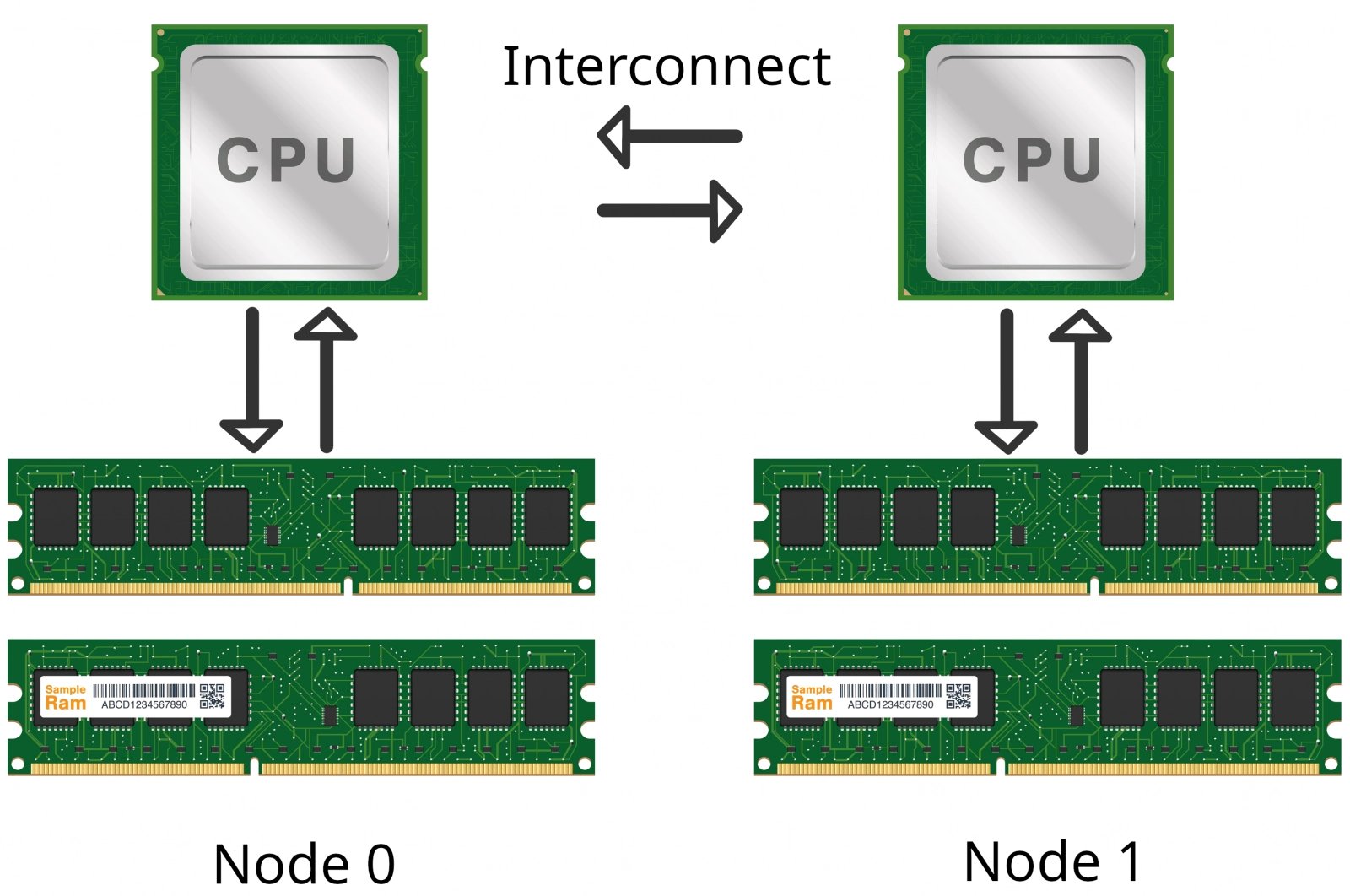 NUMA může mít obecně rychlejší přístup do paměti, jelikož paměti jednotlivých uzlů (nodes) jsou nezávislé. Přitom samotný systém vidí všechna jádra všech procesorů a také celou paměť jako jeden celek. Tím se dostáváme k nevýhodě NUMA: Když data pro procesor 0 budou v paměti obsluhované procesorem 1, musí data z paměti nejprve přečíst procesor 1 a poté je interconnectem poslat do procesoru 0. To je samozřejmě pomalejší, než kdyby se četlo z lokální paměti.