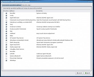 Je zde přehled všech defaultních i doplněných aplikací. Je možné je označit ke spuštění nebo naopak, nelze je ale odsud přidávat a ubírat.
