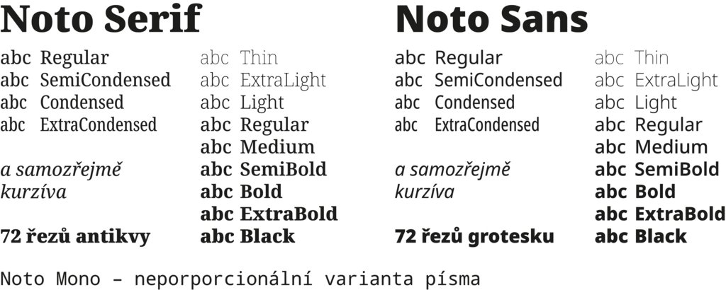 Za příklad poslouží již zmiňovaná rodina Noto, která obsahuje 72 serifových řezů Noto Serif, dalších 72 bezserifových řezů Noto Sans a neproporcionální řez Noto Mono. Navíc máte k dispozici bžilion jazykových mutací pro nelatinková písma.