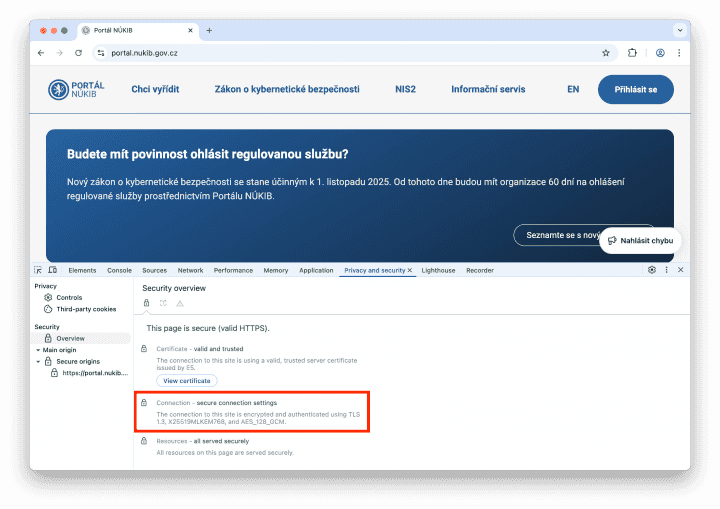 V Google Chrome zvolte položku v menu Další nástroje → Nástroje pro vývojáře a přepněte se do záložky Privacy and Security. Následně v levém menu zvolte pod Security položku Overview. V sekci Connection se dozvíte verzi použitého protokolu TLS, typ algoritmu použitého pro dohodu nad klíči a taktéž typ algoritmu pro samotné symetrické šifrování přenášeného obsahu. V případě na obrázku níže byl použit protokol TLSv1.3, symetrický klíč byl vygenerován hybridním postkvantovým algoritmem X25519MLKEM768 a symetrické šifrování probíhalo AES s 128 bitovým klíčem v módu GCM.