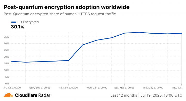 Společnost Cloudflare taktéž zveřejňuje na své webové stránce Cloudflare Radar statistiky, jak velký podíl provozu na webové služby Cloudflare je již zabezpečeno pomocí kvantově odolné kryptografie. Celosvětově je v současné době již 37 % provozu zabezpečeno proti útoku kvantovým počítačem – před rokem to bylo pouze 17 %.