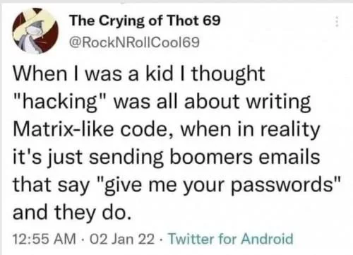 Když jsem byl dítě, myslel jsem si, že hackování znamená psát složitý kód jak v Matrixu. Ve skutečnosti stačí posílat staříkům mail „dej mi heslo“ a oni to udělají.