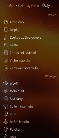 V části nastavení pro „Gesta“ doporučím po čase vypnout položku „Ukázat rady a tipy“, které jsou sice na začátku praktické, ale zvlášť při použití aplikace pro fotoaparát, jsou po nějaké době mírně iritující (aneb snažíte se pořídit snímek, ale čtvrtinu obrazovky vám překrývá nápověda). Stejně tak se ve vrchním menu zobrazují dostupné „atmosféry“, osobně trvale používám pouze jednu, takže jsem uvítal možnost je skrýt (intuitivně v nastavení „Vrchní nabídka“). Stejné menu vám povolí ve vrchním menu zobrazit plejádu ikon pro rychlá nastavení dle libosti, např. svítilnu, různé režimy, bluetooth a podobně. Praktické.