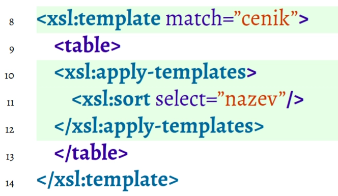 Dále už pojedeme ve starých kolejích. Balík minted interně využívá fancyvrb, takže řada jeho parametrů je shodných. Dají se nastavovat individuálně u jednotlivých vkládaných kódů, nebo plošně pro všechny. To má na starosti příkaz \setminted{ parametry}. Lze jej používat opakovaně, pozdější výskyty přidávají čí mění parametry těch předchozích. Nastavení může být specifické pro konkrétní jazyk, jehož název uvedete v nepovinném parametru. Například chceme barevně odlišit ukázky kódu v jazyce XSLT, takže jim předepíšeme jiný styl: