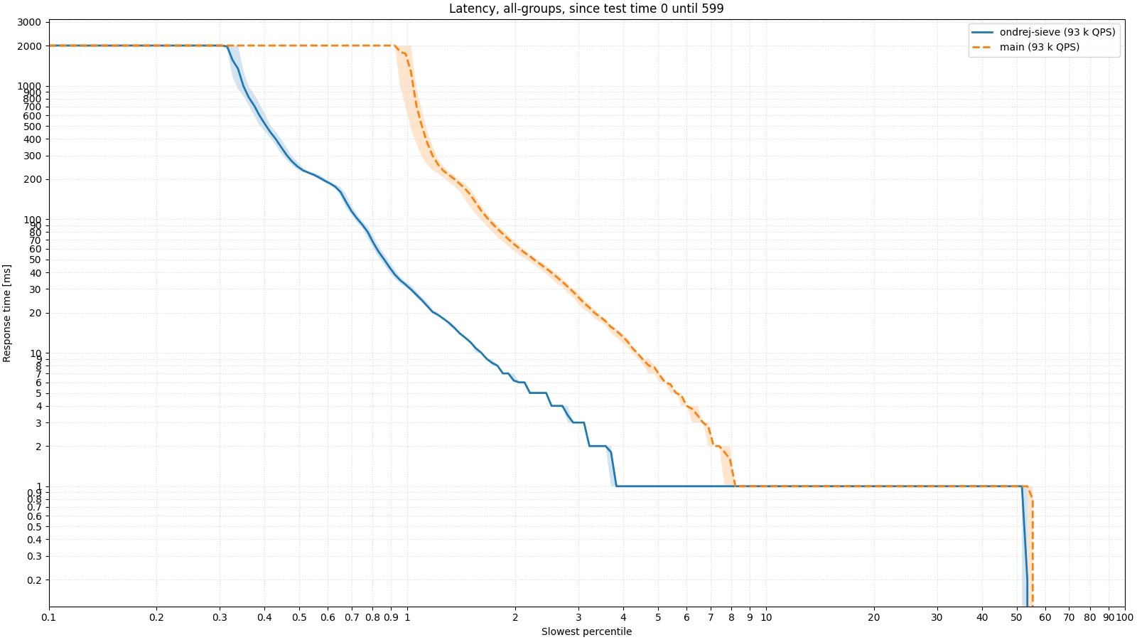 První obrázek zobrazuje latenci v první polovině testu, kdy se začíná s prázdnou keší. Druhý obrázek zobrazuje druhou polovinu testu, kde je keš už víceméně naplněná. Jde patrné, že zejména v případě naplněné keše, se SIEVE chová mnohem lépe a server je schopen odpovědět více klientům.