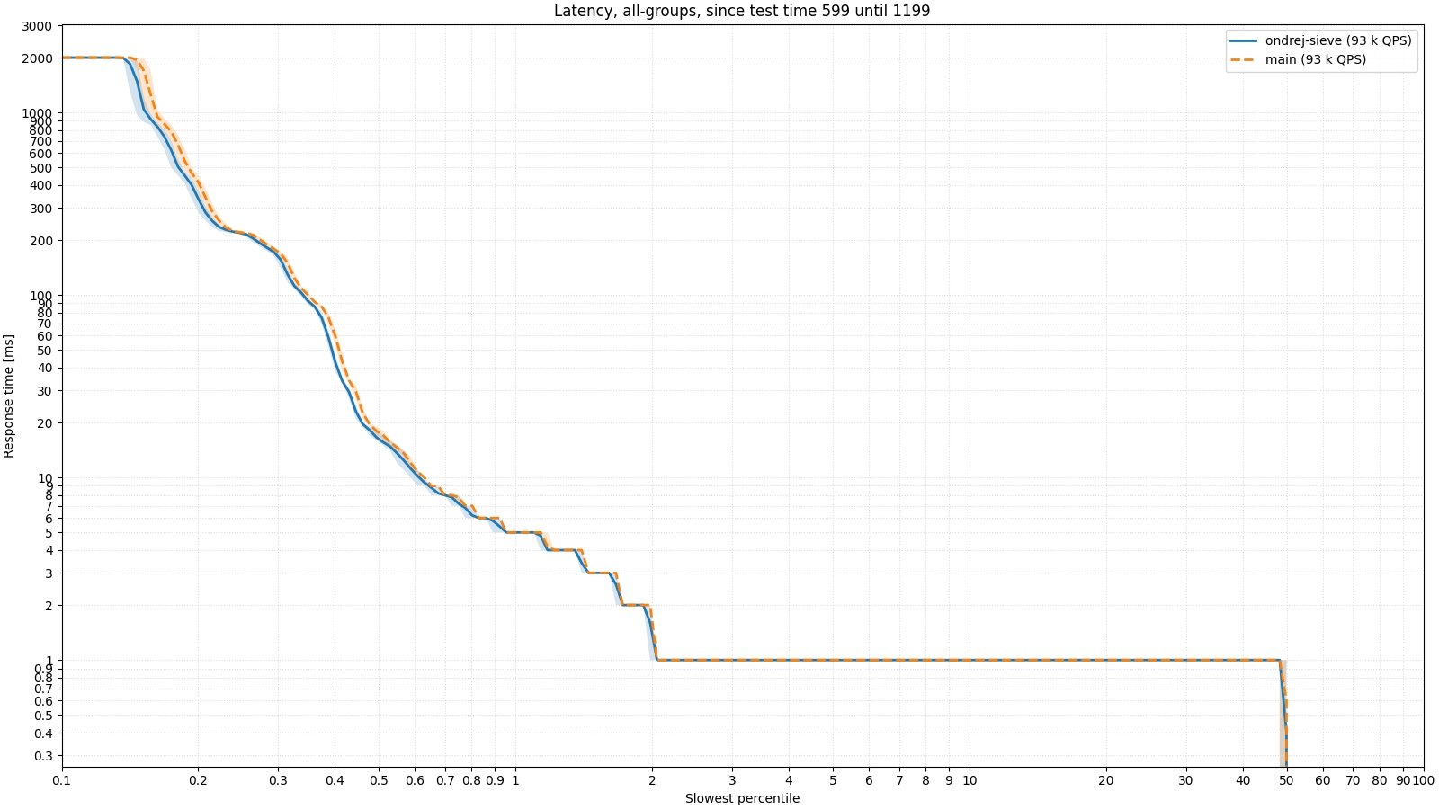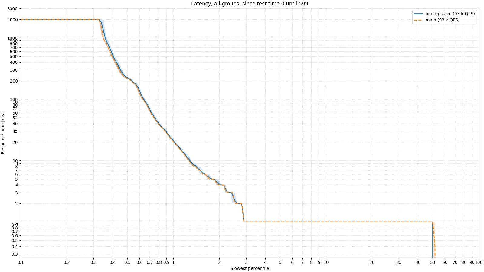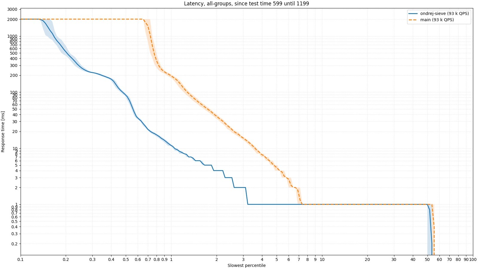 Jak to pak vypadá v praxi? Připravil jsem dva testy BIND 9 ve funkci resolveru, které probíhají nad reálnými daty poskytnutými telekomunikačním operátorem. V prvním testu je paměť resolveru ( max-cache-size) omezena na 128 MB, což je vcelku malá hodnota, keš se proto rychle zaplní. Následující obrázek zobrazuje latenci odpovědí. Podobné obrázky byly popsány předchozím článku o BIND 9, ale připomeňme si, že se jedná o logaritmický histogram percentilů. Zjednodušeně řečeno chceme, aby se linie měření tlačila co nejvíce doleva a co nejvíce dolů, což znamená, že server odpověděl co nerychleji na co nejvíce odpovědí.