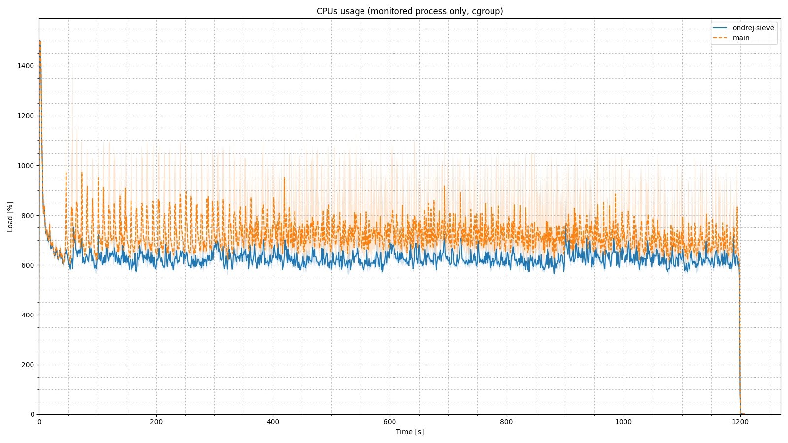 Na dalších dvou grafech vidíme využití paměti a procesoru v čase. Myslím si, že je zřejmé, že implementace SIEVE algoritmu přinesla větší stabilitu ve využití paměti v případě nepříznivých podmínek a menší zátěž na CPU.