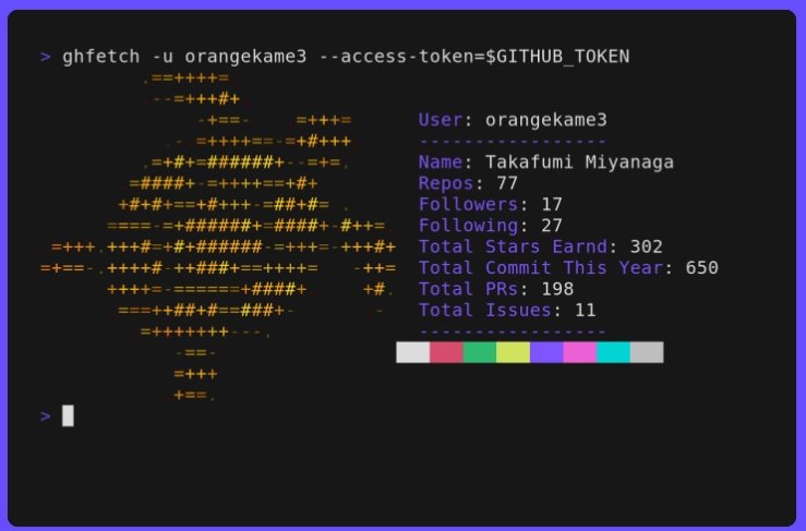 ghfetch je nástroj, který umožňuje vytvářet jednoduché reporty o uživatelích GitHubu. Zobrazuje avatara a základní informace, jako je uživatelský název, jméno, počet repozitářů, počet sledujících a sledovaných, ale také počet získaných hvězdiček, commitů pro aktuální rok, pull requestů a issues.