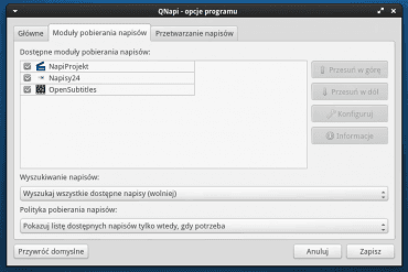 QNapi umožňuje stahovat a párovat titulky s video soubory. Podporuje výběr cílového formátu (SRT, mDVD, TMP, MPL2), ruční volbu titulků v případě nalezení více variant, hromadné stahování titulků či post-processing (např. změna kódování, nastavení oprávnění).