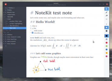 NoteKit je aplikace pro zapisování poznámek ve strukturované podobě. Obsah je ukládán ve formátu Markdown, lze jej organizovat do složek a podsložek, které je možné procházet přímo v okně v postranním panelu; a tam, kde nestačí dostupné nástroje, lze použít tužku a kreslit pomocí myši nebo dotykem.