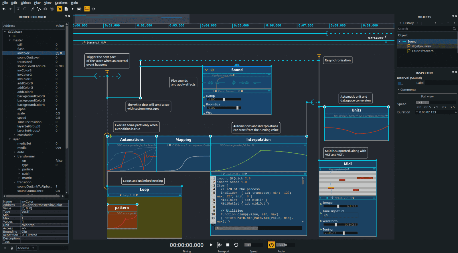 Interaktivní mezimediální sekvencer. Díky němu zvládnete prostorovou a časovou organizaci prvků různých typů médií. Umožňuje vytvářet flexibilní a interaktivní scénáře určené hlavně pro umělecké instalace, výstavy nebo jakýkoliv obsah vyžadující precizní a interaktivní spouštění načasovaných událostí.