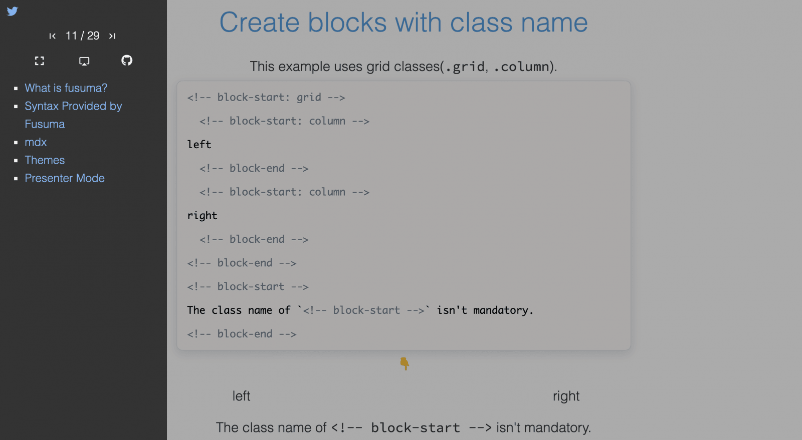 Aplikace pro tvorbu prezentací v jazyce Markdown a MDX. Mezi jeho nejsilnější stránky patří tvorba prezentací optimalizovaných pro webové stránky s podporou SEO. Podporuje javascriptovou knihovnu MathJax, díky které zvládá vytvářet vzorečky, rovnice nebo diagramy.