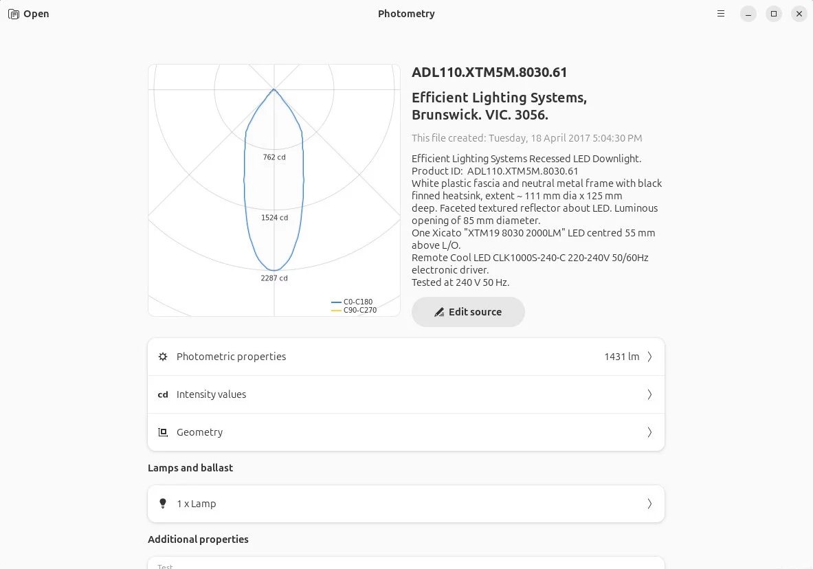 Jednoduchá aplikace pro prohlížení fotometrických dat. Umožňuje prohlížení rozložení světla světelných zdrojů, jako jsou lampy a svítidla a má grafické rozhraní s dostatečnými možnostmi přizpůsobení. Nabízí grafické zobrazení křivek rozložení světla, možnost editovat zdrojový soubor v aplikaci, širokou škálu obecných informací a fotometrických vlastností. V neposlední řadě poskytuje uživatelům různé způsoby úpravy fotometrie a preferované jednotky měření.